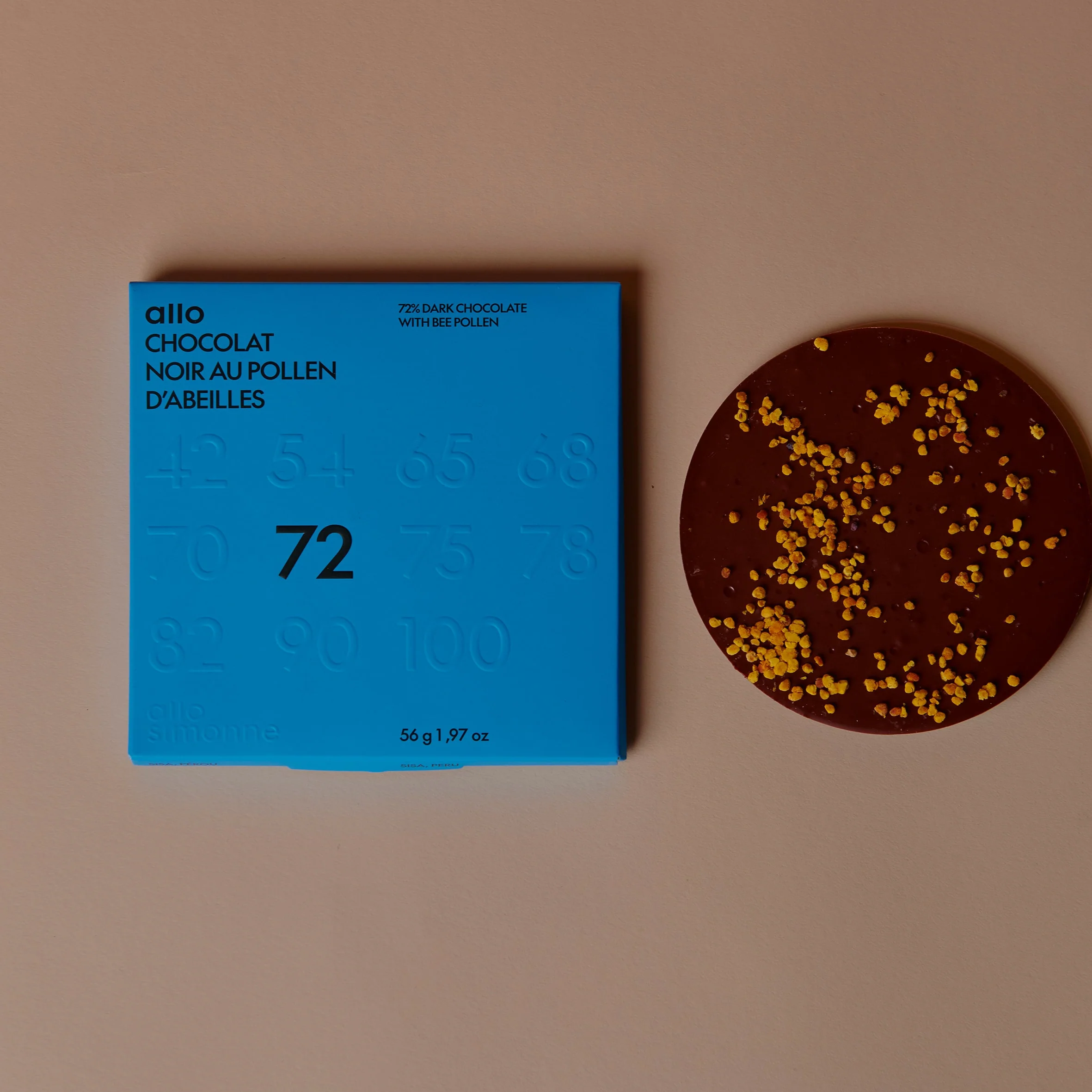 Nestled in the fertile San Martín region of central Peru, a collective of 250 producers from the Quechua Lamista community of San José de Sisa carefully cultivates aromatic cacao beans. This mountainous terroir produces a 72% dark chocolate with vibrant citrus notes, subtly enhanced by bee pollen, which gives it floral notes and a delicate sweetness.