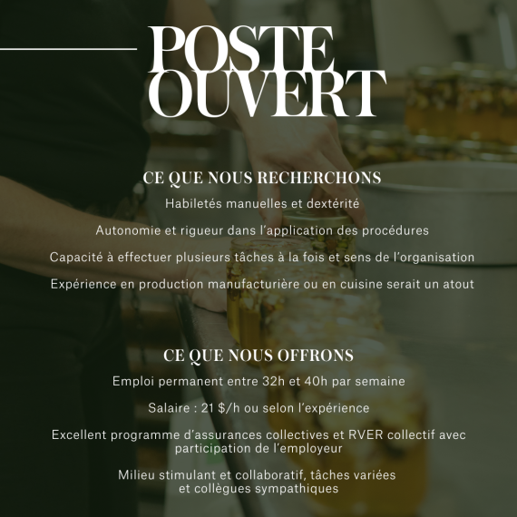 - Expérience en production manufacturière ou en cuisine serait un atout