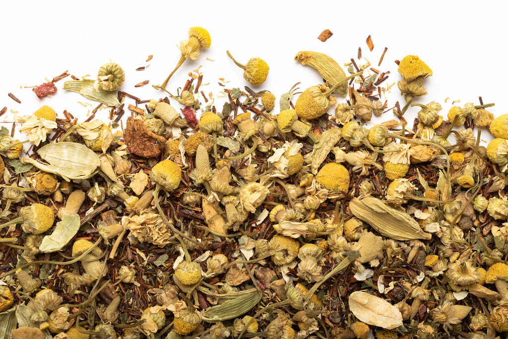 Ingrédients : camomille*, rooibos*, cardamome*, cannelle*, gingembre*, feuilles de mûrier*, muscade*, canneberges*, arômes naturels (cassis), morceaux d’orange*, arômes naturels (orange), arômes naturels (canneberge), morceaux de fraise*.
