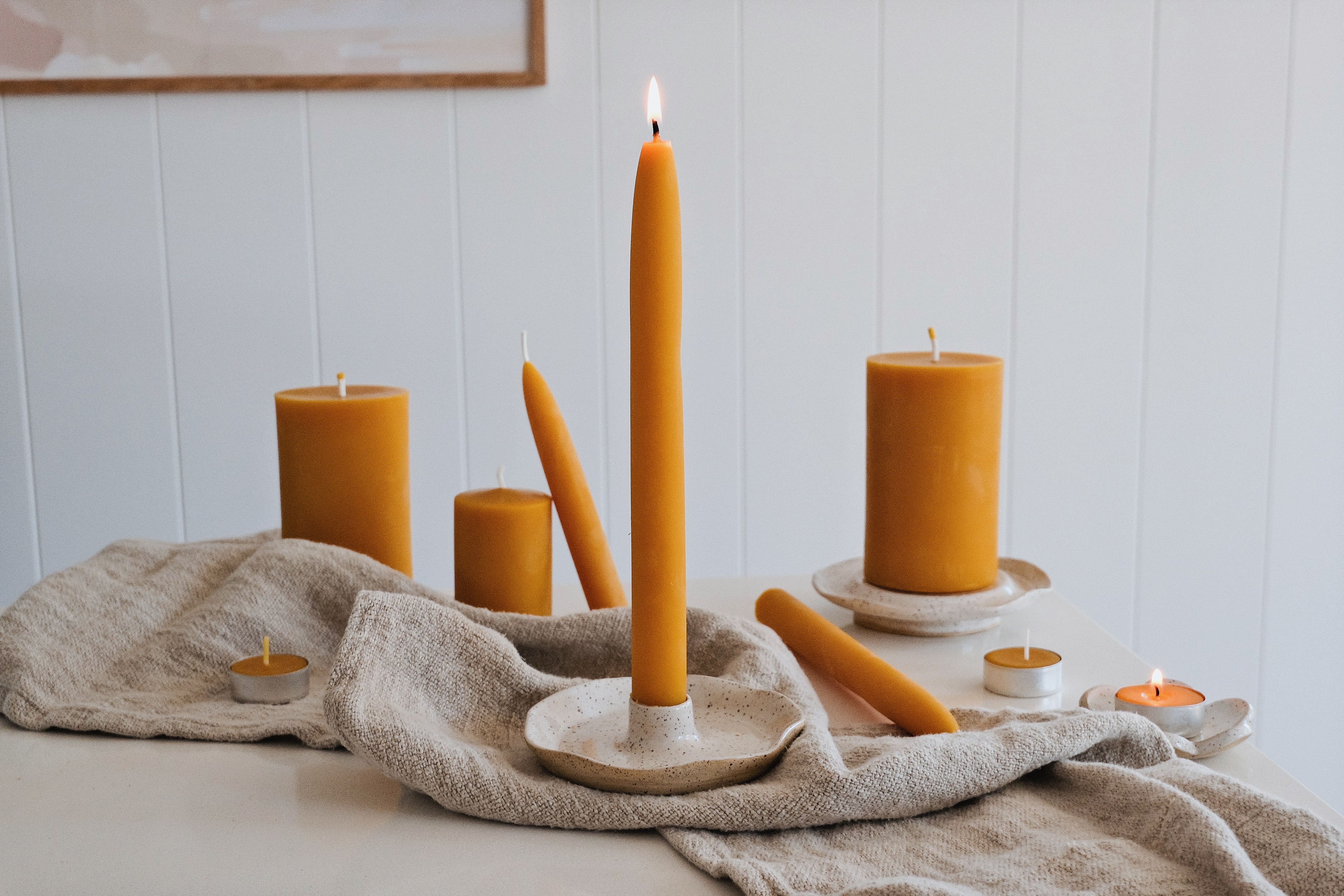 Nous sommes fiers de mettre en valeur la cire d’abeille issue de nos ruches. Fabriquées à la main dans notre atelier, nos bougies offrent une douce odeur naturelle et agréable dans la maison.