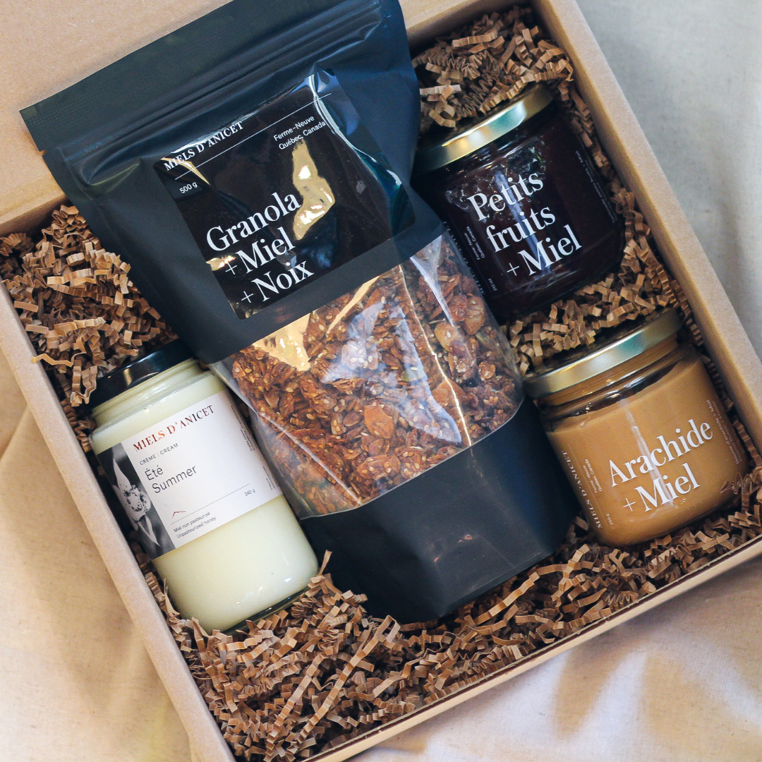Pour débuter la journée du bon pied, surprenez votre tablée avec cette belle boîte de gourmandises mielleuses à partager.