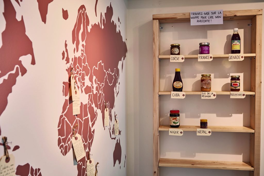 Nos tablettes sont garnies de produits gourmands faits dans la cuisine de la ferme et fabriqués à base de miel : moutardes, granola, tartinades, pains épices, chocolats, confitures et friandises.